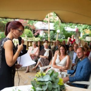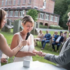 Dit weekend heeft Karolien onze huwelijksceremonie in goede banen geleid. Het was een heel persoonlijke ceremonie op een vlotte manier gebracht. We hebben veel complimentjes gekregen van onze gasten. Voor sommigen was het zelfs de mooiste ceremonie die ze al hadden bijgewoond. Dank u wel Karo!