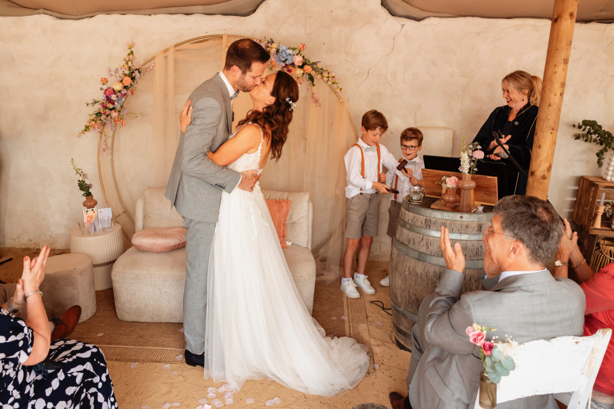 De kinderen liepen met je weg, werden helemaal betrokken bij de ceremonie en de ceremonie kon zelfs even op pauze gezet worden voor een plaspauze. Je kan goed improviseren 😉