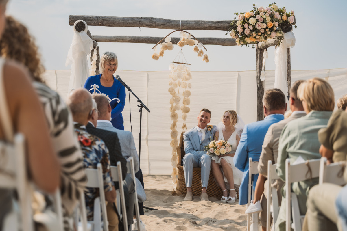 Op vrijdag 3 september 2021 zijn mijn man en ik getrouwd op het strand van Callantsoog. Na een zoektocht in het aanbod van trouwambtenaren hebben wij uiteindelijk Simona gevraagd of zij onze BABS wilde zijn. Na een Facetime gesprek bleek dat er een klik was en zo zijn wij in zee gegaan met Simona. Daar hebben wij geen seconde spijt van gehad. Simona is een spontane goedlachse vrouw met veel humor. Lekker los en vrij in de omgang, betrokken en geïnteresseerd, precies zoals wij dat graag zien. We hebben elkaar voor het eerst ontmoet op onze trouwlocatie in Callantsoog ( wij wonen zelf in Drenthe ), een gezellig en ongedwongen gesprek volgde. We hebben elkaar de nodige vragen gesteld en Simona is toen aan de slag gegaan met de vergaarde informatie. Daarbij moet je denken aan het contacteren van familieleden en vrienden, het opstellen van een super leuke speech en ze dacht mee over het invullen van tijd op de grote dag. Over de hele linie zijn wij erg tevreden over Simona, als we het over zouden moeten doen, kozen we weer voor haar! Mede door Simona is onze grote dag een onvergetelijke dag geworden! Dus wij geven Simona een dikke pluim!